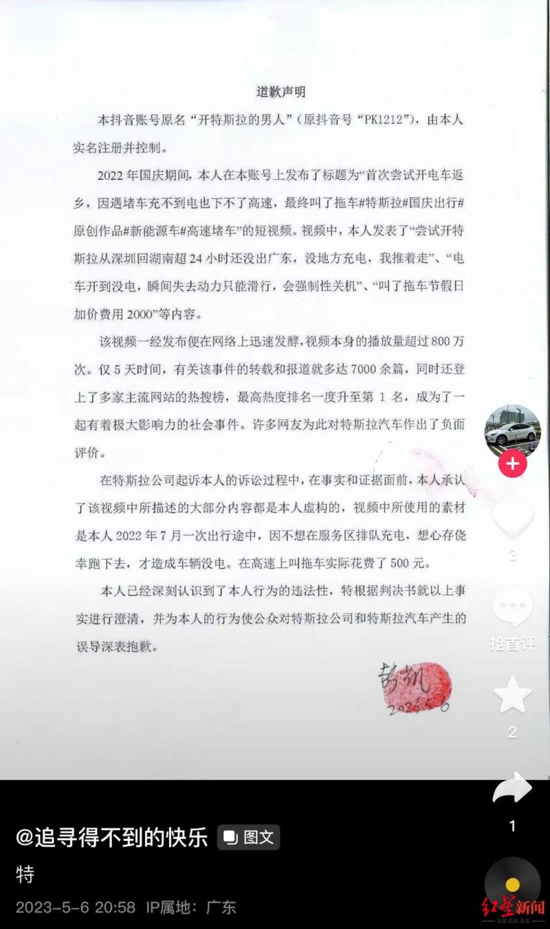 声明称赔礼,人”(原账号PK1212抖音账号“开特斯拉的男拍摄者公开道歉:大部分内容虚,凯)认可本名彭,斯拉从深圳回湖南超24幼时还没出广东正在2022年国庆时代揭橥的“测试开特,方充电没地,电车开到没电我推着走”“,力只可滑行霎时失落动,日加价用度2000元”等视频会强造性合机”“叫了拖车节假,实质都是假造此中大个别。