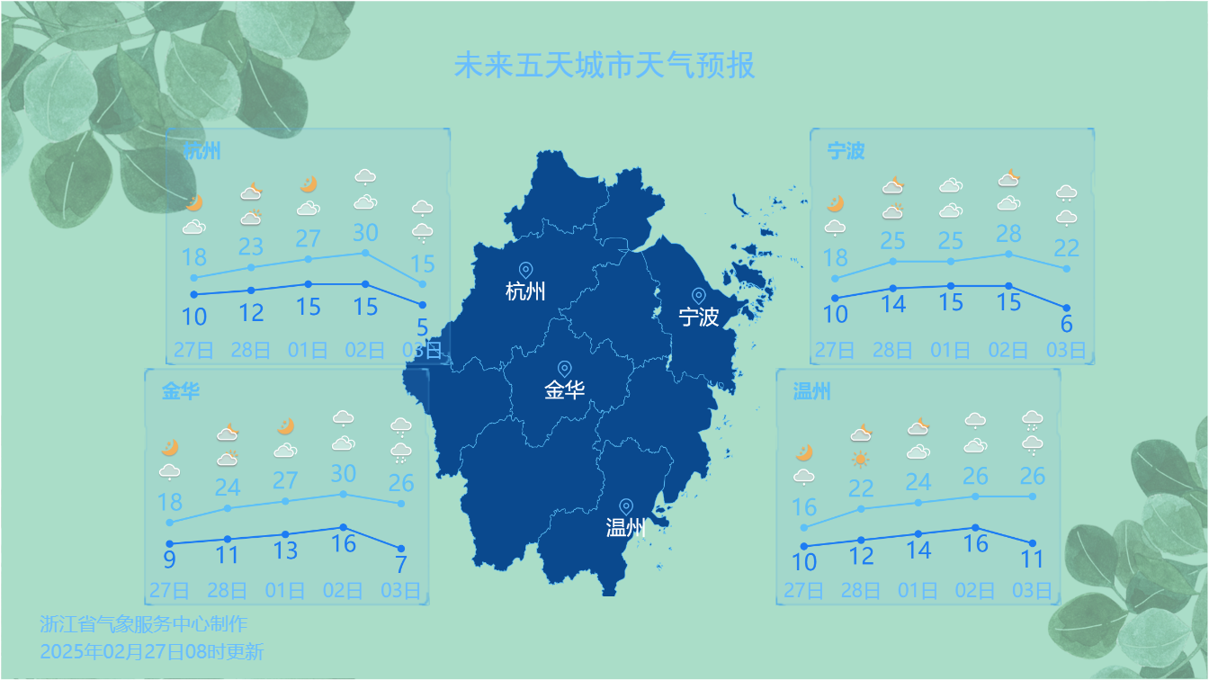 江先晴后雨来日七天浙,升后降气温先。比昨天更高这日色温会,本次升温极点周六周日达,28-30℃大部最高气温,初夏恍若;气流和冷氛围前后影响2日后期到3日受暖湿,温、降水和大风经过浙江有一次明白的降,接拦腰斩气温直,强对流天色且恐怕伴有。