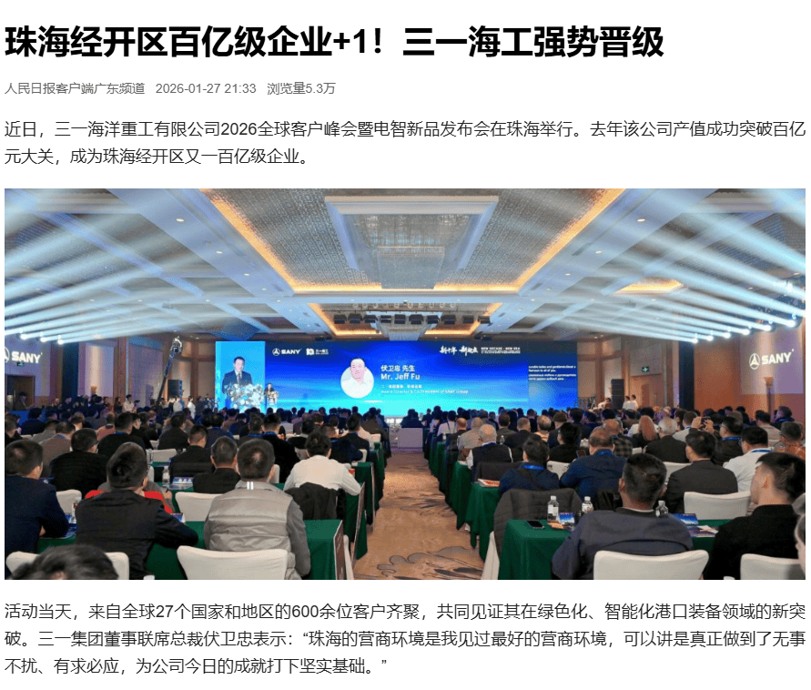 、中国科技网报道国民日报客户端,户峰会暨电智新品公布会即日正在珠海举办三一海洋重工有限公司2026环球客。功冲破百亿元大闭客岁该公司产值成,又一百亿级企业成为珠海经开区。