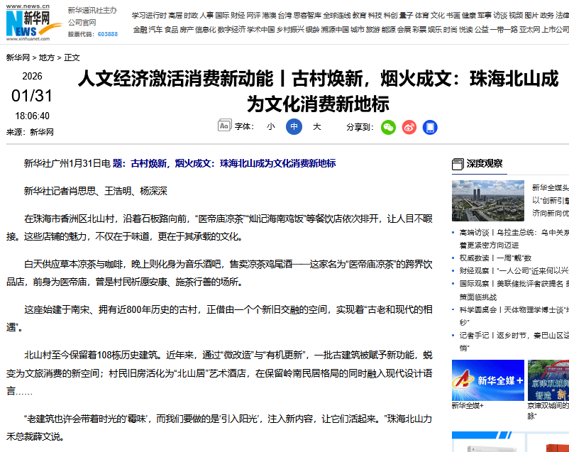 31日报道新华社1月,00年汗青的珠海北山村始修于南宋、具有近8,与“有机更新”通过“微改造”,被给予新功用一批古兴办,消费的新空间蜕变为文旅;北山居”艺术旅社村民旧房活化为“,代打算言语……成为文明消费新地标正在保存岭南民居体例的同时融入现。