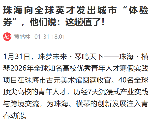 户端报道南方+客,31日1月,出名高校良好青年人才寒假实行项目正在珠海完竣收官珠梦另日・琴鸣寰宇——珠海・横琴2026年环球。高校的青年人才40名环球顶尖yaxin111.net业实行与跨境交换历经7天重溺式产,新进展注入芳华动能为珠海、横琴的创。