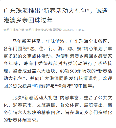 客户端报道光昭质报,春将至马年新,渐浓年味。旋里感应田园年味为便当港澳乡亲,0余场次的“新春运动大礼包”珠海市委统战部梳理80项50,胞发出热忱邀约向宏壮港澳同,韵”与“珠海味”的中国年接待旋里感应独具“岭南。