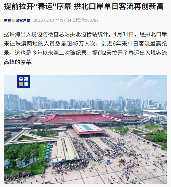 客户端报道央视消息,31日1月,的职员数目超45万人次经拱北港口来往珠澳两地,日客流最高记录创近6年来单。来第二次破记录这也是本年以,进出境客流岑岭的序幕提前2天拉开了春运。